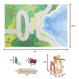 - PRODUCT DETAILS - Materials: Wood, Plastic. Dimensions: Table (L) 32.5" x (W) 23.5" x (H) 15.75". In the Box: 27 tracks, 3 trains, 2 boats, 2 cars, 1 helicopter, 1 bridge, 1 train station, 1 fuel station, 4 buildings, 13 trees, 9 street signs, and more.