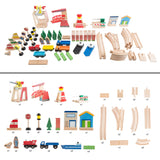 - 75-PIECE TRAIN ACTIVITY TABLE - These kids play table includes 27 wooden train tracks, 3 magnetized wooden trains, 1 helicopter, 2 boats, 4 vehicles, a bridge, a train station, a fueling station, buildings, trees, street signs, and many other accessories.